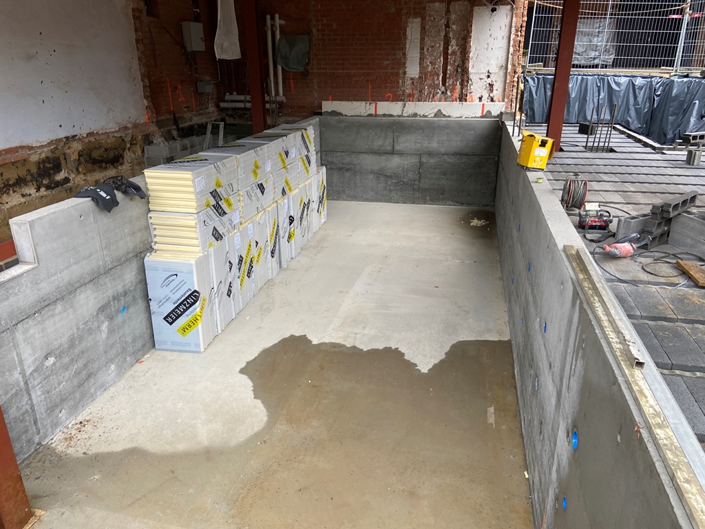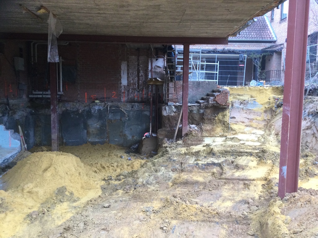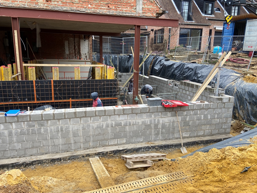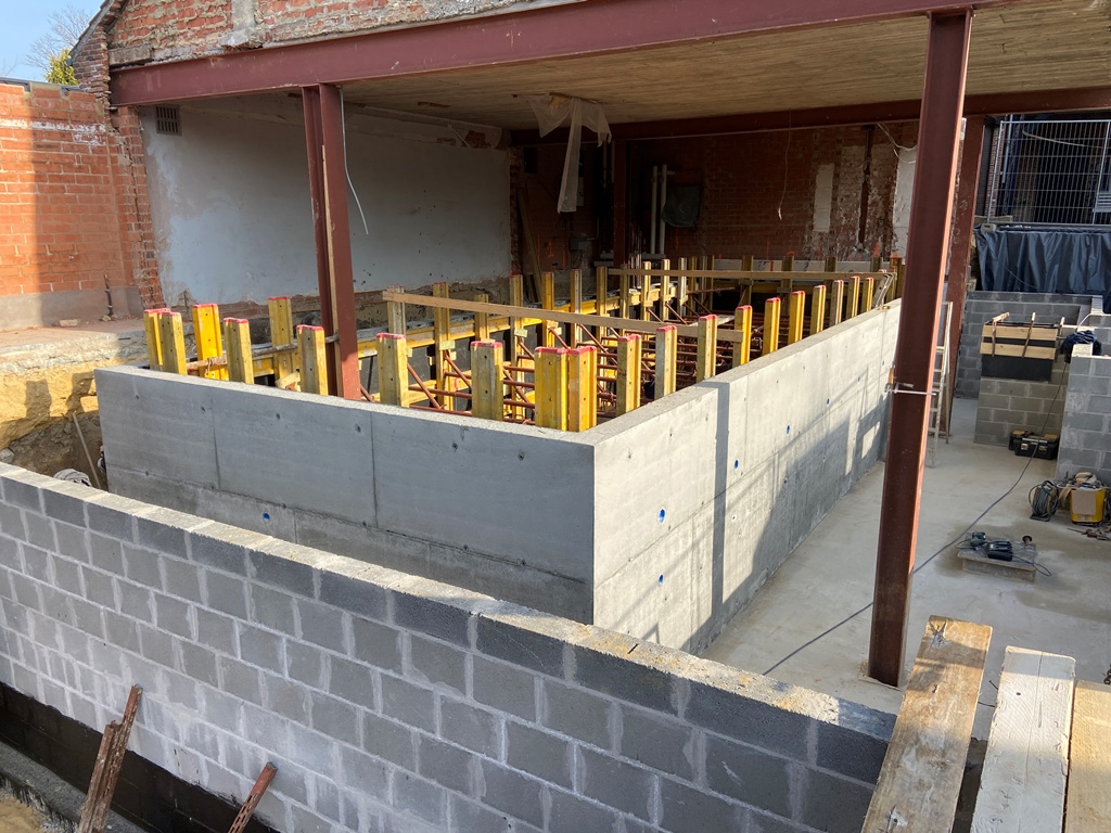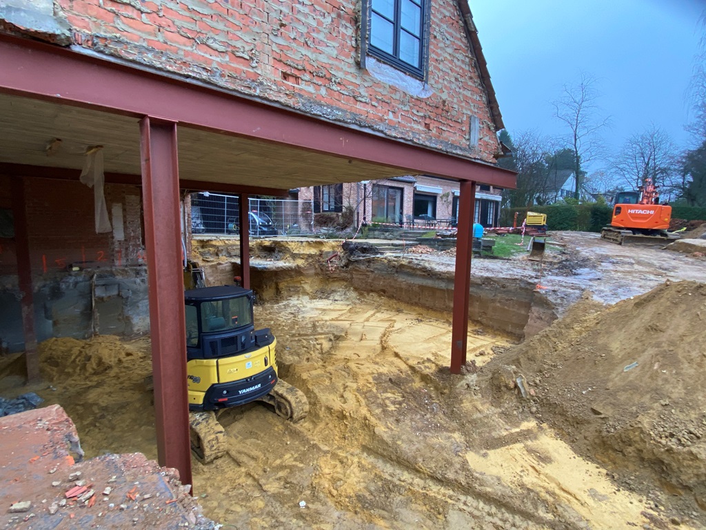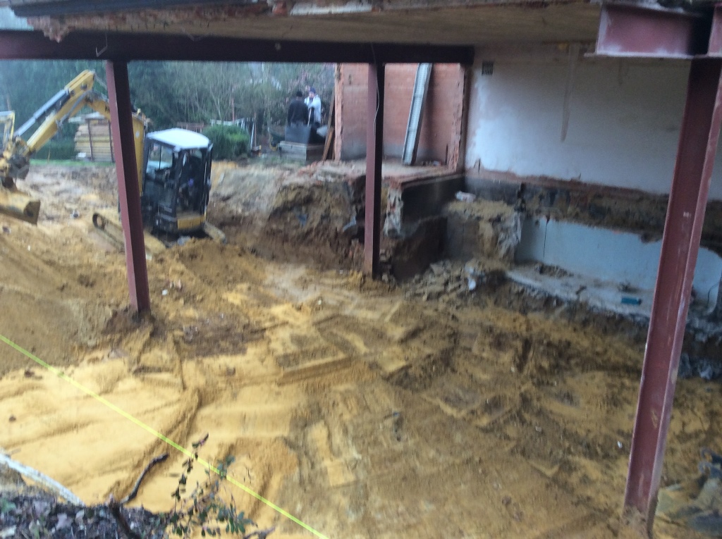 Ce chantier, très technique, consiste à préserver la partie supérieure de l’immeuble existant, procéder à la démolition de tout le rez-de-chaussée et approfondir le niveau des fondations pour créer une nouvelle piscine avec caves périphériques.
