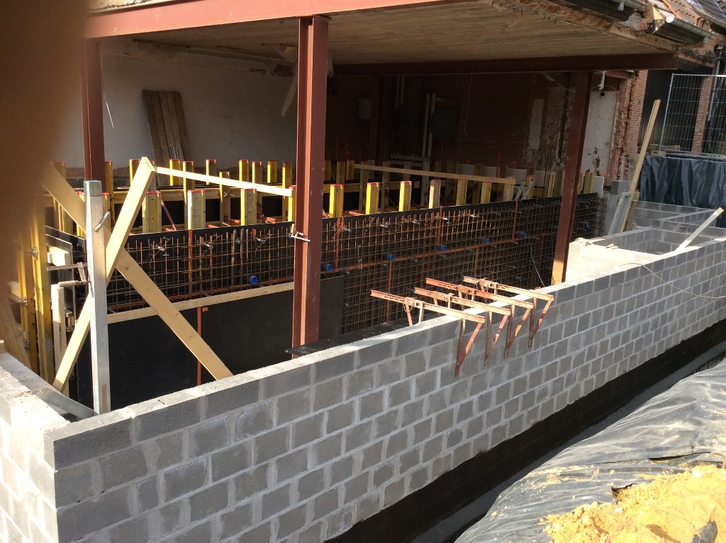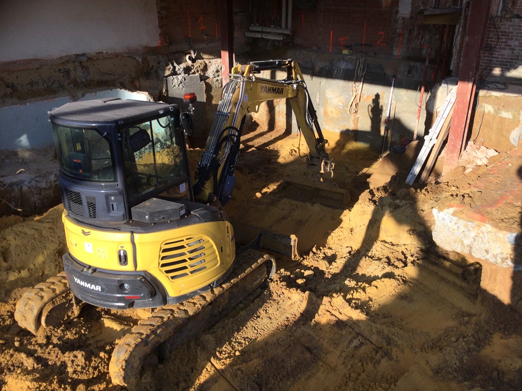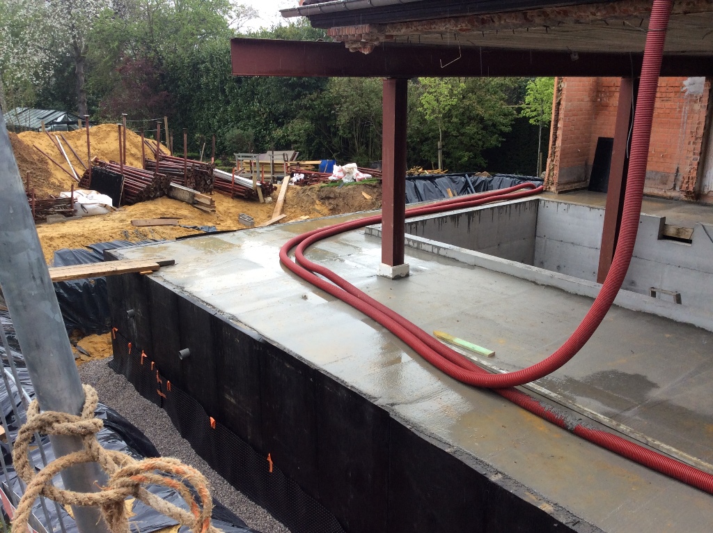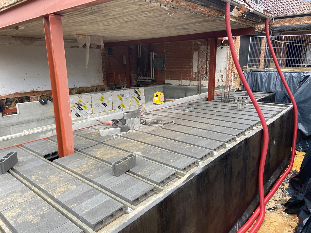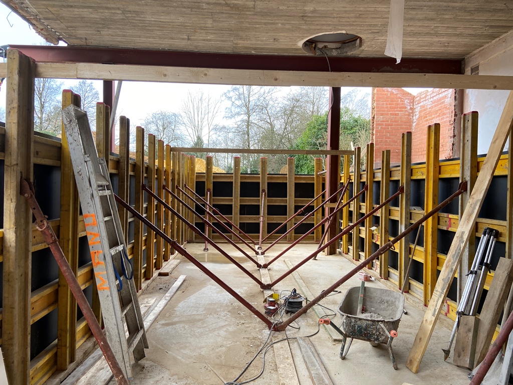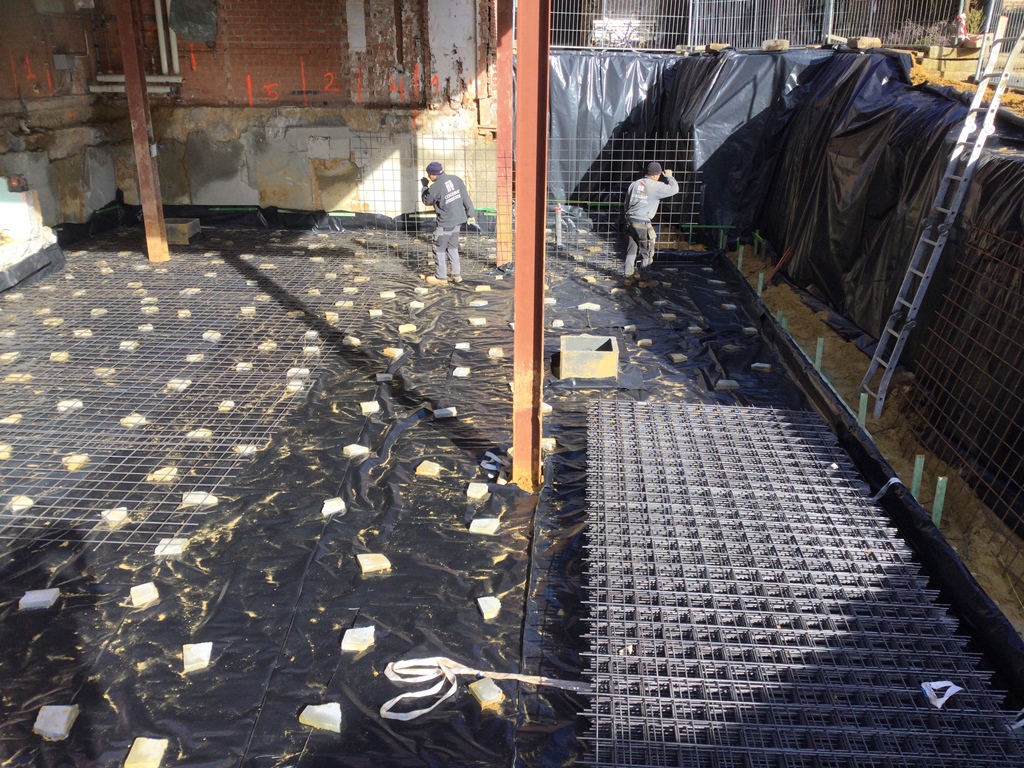 Ce chantier, très technique, consiste à préserver la partie supérieure de l’immeuble existant, procéder à la démolition de tout le rez-de-chaussée et approfondir le niveau des fondations pour créer une nouvelle piscine avec caves périphériques.